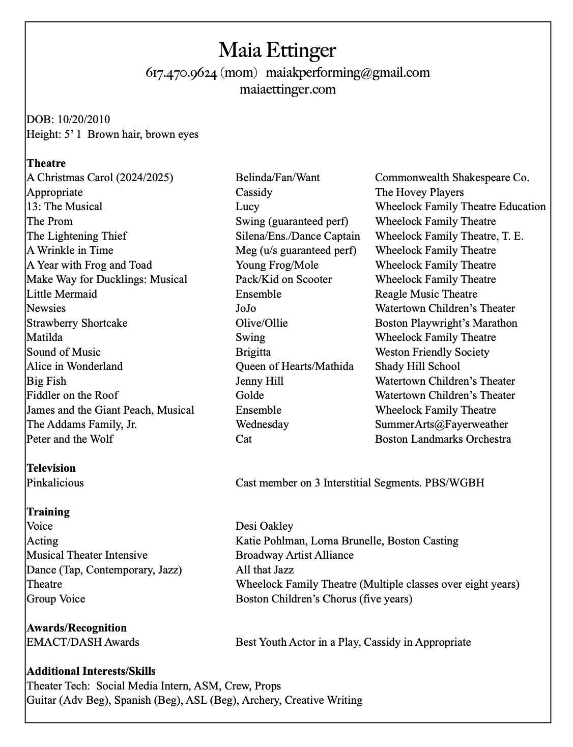 Maia Ettinger is a Boston-based actor with a passion for telling meaningful stories through drama and comedy. She has been working professionally since the age of 5 and has been seen in many professional and community theatres in the Boston area.
